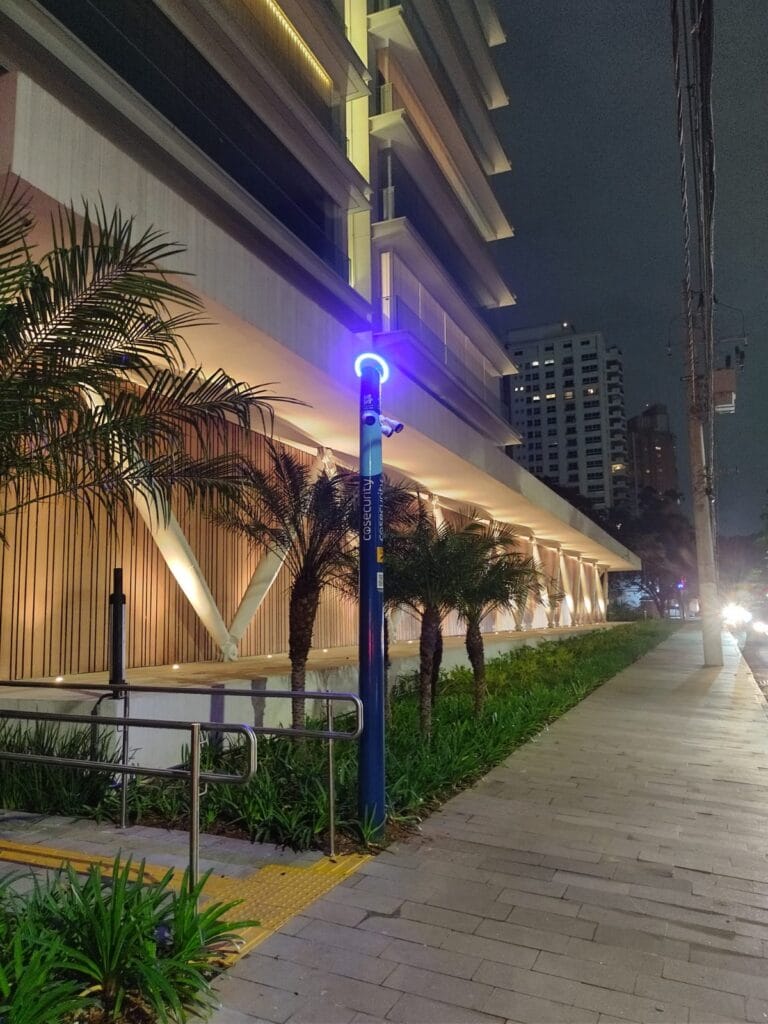 Torre de 3 câmeras, recomendada para condomínios, que proporciona visão 180° do perímetro externo e possui um qr-code acessível para todos reportarem incidentes.